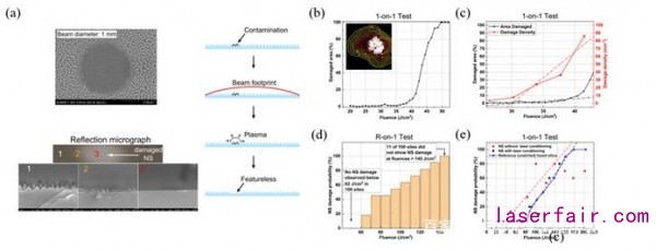 圖2 樣品激光損失實(shí)驗(yàn)結(jié)果:(a)納米結(jié)構(gòu)表面損傷形貌SEM表征;(b)和(c)351nm激光損傷試驗(yàn)結(jié)果;(d)和(e)1053nm激光損傷試驗(yàn)結(jié)果。