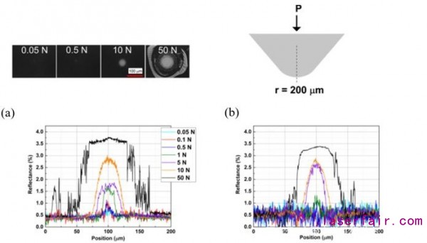 圖3 納米結(jié)構(gòu)靜態(tài)魯棒性實(shí)驗(yàn)結(jié)果:使用半徑為200μm的標(biāo)準(zhǔn)尖端加載(a)351nm結(jié)構(gòu)和(b)1053nm結(jié)構(gòu),負(fù)載范圍為50 mN至50 N。