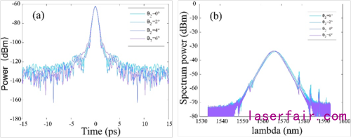 圖2 實驗中不同角度下的脈沖時域波形和鎖模光譜