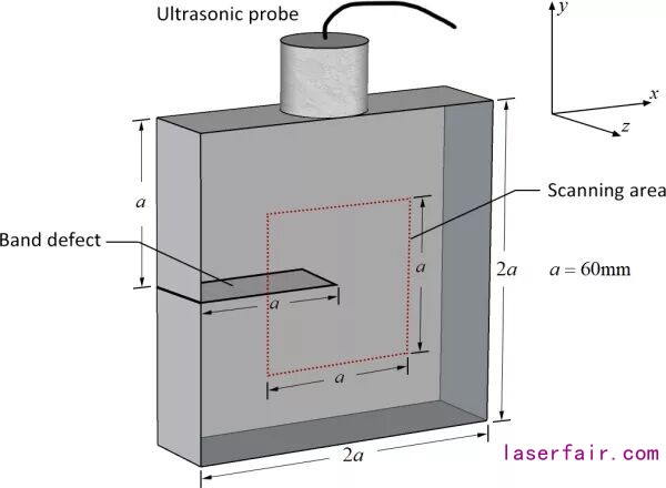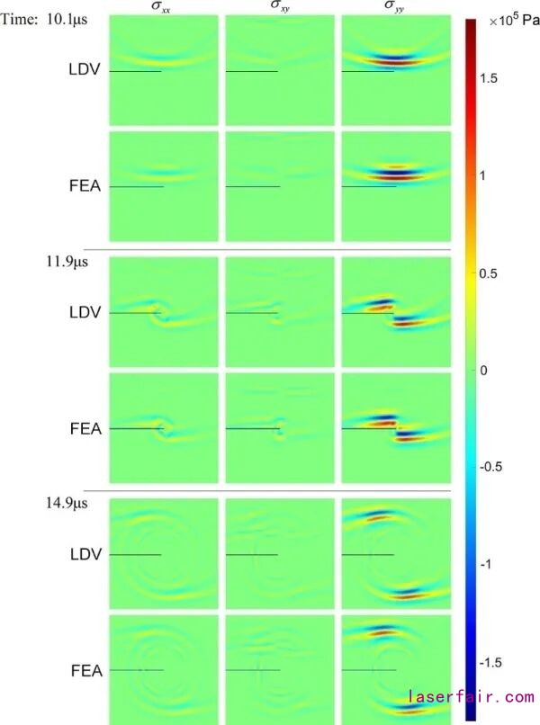 該研究用一個具有帶狀缺陷的K9光學(xué)玻璃塊進行測試。由超聲換能器激發(fā)的縱波從玻璃塊頂端向下傳播,并被帶狀缺陷散射。LDV記錄下了各個時刻的彈性波圖像,包括三個獨立的應(yīng)力分量。有限元仿真(Finite element analysis,F(xiàn)EA)結(jié)果驗證這種新型的測量方法。