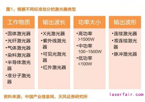 脈沖激光器:以脈沖形式輸出能量,根據(jù)脈沖寬度,脈沖激光器可進(jìn)一步分為毫秒激光器、微秒激光器、納秒激光器、皮秒 激光器及飛秒激光器等,其特點(diǎn)是加工精度高,且脈寬越窄,加工精度越高,常應(yīng)用于激光標(biāo)刻、非金屬材料加工、醫(yī)療及 航空航天等。
