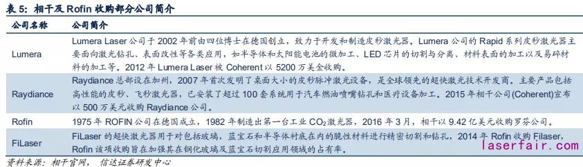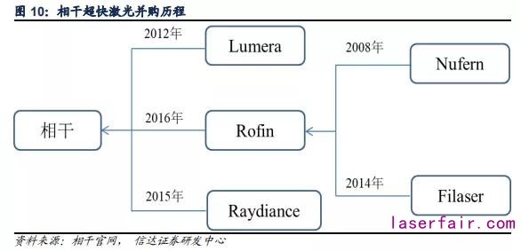 相干通過收購進(jìn)軍超快激光領(lǐng)域。相干作為全球激光器的領(lǐng)軍企業(yè),也察覺到了超快激光器未來發(fā)展前景,通過收購 Lumera Laser、Rofin、Raydiance 等公司,進(jìn)軍超快激光器領(lǐng)域。其中 Lumera Laser 公司于 2002 年前由四位博士在德國創(chuàng)立,致力于開發(fā)和制造皮秒激光器,2012 年被相干以 5200 萬美金收購;Raydiance 的超快激光器已經(jīng)在汽車燃油噴嘴鉆孔和醫(yī)療設(shè)備加工等領(lǐng)域具有廣泛應(yīng)用,2015 年被相干以 500 萬美金收購;Rofin 是全球激光器的優(yōu)質(zhì)企業(yè),在超快激光器領(lǐng)域也早有布局,被相干以 9.42 億美元收購。