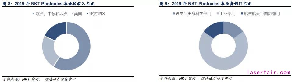 從地區(qū)來看,NKT Photonics 在歐洲,中東和非洲等地區(qū)的收入占比為 59%,美國地區(qū)的收入占比為 23%,亞太地區(qū)的占比為 18%。分業(yè)務(wù)來看,公司業(yè)務(wù)根據(jù)下游應(yīng)用可以分為醫(yī)學(xué)與生命科學(xué)領(lǐng)域、工業(yè)領(lǐng)域和航空航天與國防領(lǐng)域,其中在生命科學(xué)領(lǐng)域公司超快激光器主要應(yīng)用在眼科、外科支架的精密加工等領(lǐng)域,在營收中占比約為 15%;工業(yè)領(lǐng)域公司超快激光器主要應(yīng)用在 OLED 等脆性材料的精密加工,在營收中占比約為 70%;航空航天領(lǐng)域公司產(chǎn)品主要以激光武器的形式驅(qū)逐機場的無人機,在營收中的占比約為 15%。