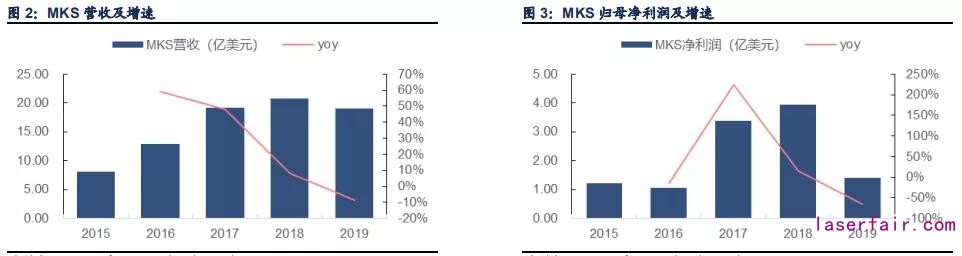 2019 年 MKS 實現(xiàn)營收 19.0 億美元,同比下降 8.45%,實現(xiàn)歸母凈利潤 1.40 億美元,同比下降 64.27%。2019 年公司收入端下滑的主要原因是年公司真空和分析部門的收入減少了 2.704 億美元;凈利潤出現(xiàn)較大幅度下滑主要是原材料成本上升、產(chǎn)能利用率下降以及收購 SEI 帶來的并購費用。