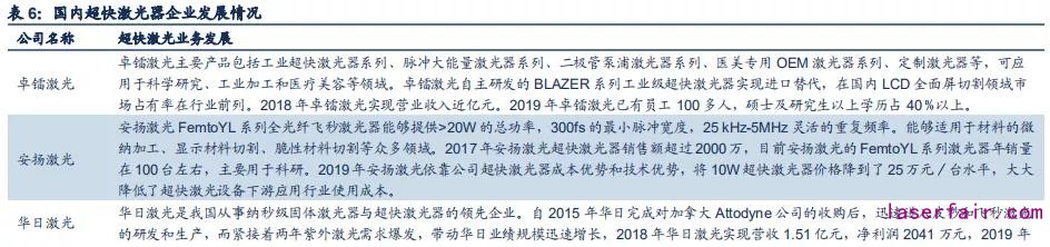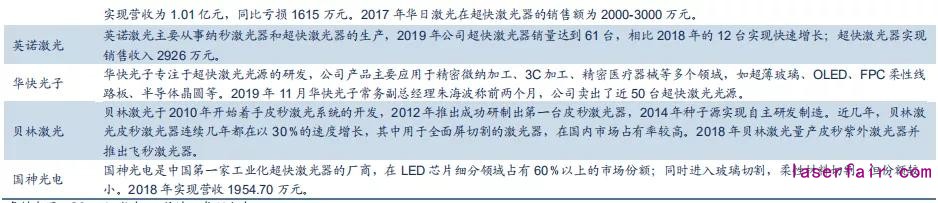 國內(nèi)超快激光器企業(yè)快速崛起。目前,國內(nèi)超快激光器企業(yè)也實現(xiàn)了快速增長,成長了卓鐳激光、安揚激光、華日激光、英諾激光、華快光子、貝林激光、國神光電等較為優(yōu)質(zhì)的超快激光器企業(yè)。2018 年卓鐳激光營業(yè)收入達(dá)到 1 億元左右,在 LCD全面屏切割領(lǐng)域的市占率達(dá)到國內(nèi)前列,安揚激光超快激光器銷量達(dá)到 100 臺左右,英諾激光超快激光器銷量達(dá)到 61 臺。此外,激光器下游設(shè)備廠商也加大了超快激光器的布局,如大族激光于 2018 年推出其首款超快激光器新品,銳科激光通過收購國神光電也加快了超快激光器的布局。
