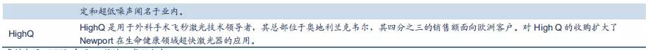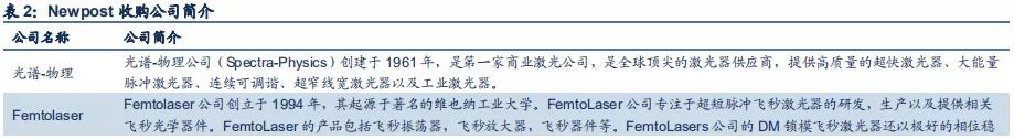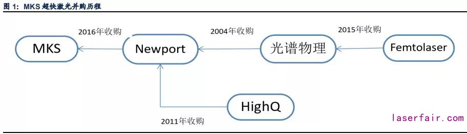 MKS 通過收購 Newpost 實現(xiàn)超快激光器產(chǎn)業(yè)鏈布局。Newpost 于 2004 年收購光譜-物理,晉級為全球超快激光器的龍頭企業(yè)。2011 年收購 HighQ 后,完善了生命健康領(lǐng)域超快激光器的布局;2015 年通過子公司光譜-物理收購 Femtolaser 后在超快激光器的核心零部件的自制能力得到顯著提升。2016 年 4 月 29 日,MKS 以 9.8 億美元完成 Newpost 及光譜物理等資產(chǎn)的收購,成為了全球超快激光器領(lǐng)域的龍頭企業(yè),2015 年 Newpost 的銷售收入約為 6.03 億美元。
