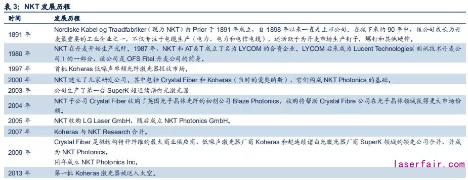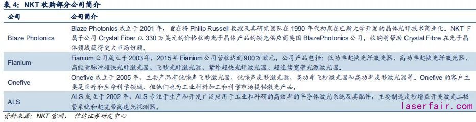 NKT 通過一系列并購超快激光器競爭實力顯著提升。NKT A/S 集團成立于 1891 年,旗下有兩個獨立的公司 NKT 和 NKT Photonics。其中 NKT 成立較早,早期主要從事光纖以及電力電纜解決方案等;2009 年,NKT 旗下的 Koheras 公司和 SuperK公司合并后成立 NKT Photonics,主要從事光纖激光器和光子晶體光纖。2016 年 NKT Photonics 收購英國光纖激光器制造商Fianium,2017 年收購瑞士超快激光制造商 onefive 和 ALS。通過一系列并購后,NKT Photonics 超快激光器競爭實力顯著提升。