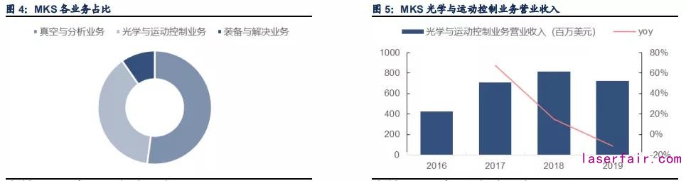 MKS 超快激光所在的光學(xué)與運動控制業(yè)務(wù)收入規(guī)模達(dá)到 7.25 億美元。MKS 主要業(yè)務(wù)可以分為三大組成部分,真空與分析業(yè)務(wù)、光學(xué)與運動控制業(yè)務(wù)以及裝備與解決方案業(yè)務(wù),2019 年上述三塊業(yè)務(wù)在公司營收中的占比分別為 52%、38%和 10%。公司真空與分析業(yè)務(wù)主要為工業(yè)提供壓力和流量的測量與控制系統(tǒng);裝備與解決方案業(yè)務(wù)主要是 2019 年收購的 SEI 后成立的部門,主要提供精密激光加工的解決方案;光學(xué)與運動控制業(yè)務(wù)包括超快激光、放大器、泵浦激光器、固體激光器、高能脈沖激光器等。2019 年公司激光與光學(xué)產(chǎn)品業(yè)務(wù)收入達(dá)到 7.25 億美元。