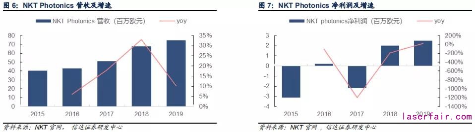 NKT Photonics 收入保持穩(wěn)定增長。NKT Photonics 近幾年來收入保持穩(wěn)定增長,2015 年至 2019 年 NKT Photonics 收入從4060 萬歐元增長至 7460 萬歐元,年復(fù)合增速為 16.43%;凈利潤略有波動,近兩年開始穩(wěn)步增長,2019 年實現(xiàn)凈利潤 250萬歐元,同比增長 25%。