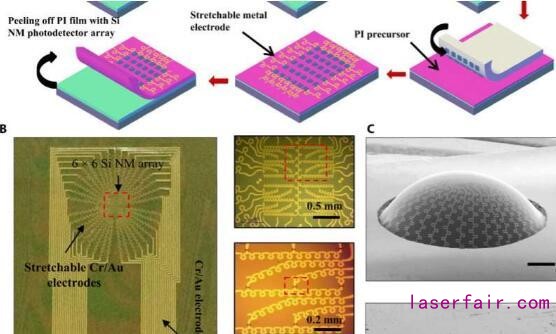 為了證明應變誘導的調諧及其對光敏技術的影響,Katiyar等人。記錄字母“ Y”的光電流圖形,該圖形首先以蔭罩的形式制造在玻璃基板上。在達到約1.8%的應變水平后,他們記錄了可觀的光電流,以在1310 nm SWIR光下清晰地成像“ Y”。隨著凸出測試腔中的應變壓力增加,每個光電二極管像素中的應變也增加,最終增加了光電流的進程,以最大3.5%的應變實現(xiàn)圖像。使用壓力誘導的鼓脹方法,研究小組獲得了Si-NM PD像素陣列的凸半球結構,該結構也受到昆蟲的復眼生物啟發(fā)而用于廣角光檢測。