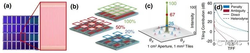 SOPA瓦片陣列形式的光束操縱。(a)完成制造的SOPA瓦片陣列的圖像。(b)不同瓦片填充系數(shù)(TFF)的SOPA瓦片陣列示意圖。(c)不同TFF值的SOPA瓦片陣列產(chǎn)生的輻射圖型(放大20倍)。(d)用于直接檢測和外差檢測時(shí),TFF值與信噪比的關(guān)系圖。