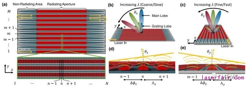 操縱2D波長的單個(gè)SOPA瓦片示意圖。(a)單個(gè)SOPA瓦片拓?fù)涫疽鈭D;M行光柵波導(dǎo)陣列(紅色)呈蛇形排布,與反激(藍(lán)色)串行連接。每行有N個(gè)光柵周期。(b)對光束的粗略(慢)操縱。(c)對光束的精細(xì)(快)操縱。(d)沿θx的粗略操縱,每個(gè)光柵波導(dǎo)將光衍射到與波長相關(guān)的齒到齒相位延遲決定的角。(e)沿θy方向的精細(xì)微調(diào),光柵陣列將光衍射到與波長相關(guān)的行到行相位延遲決定的角度。