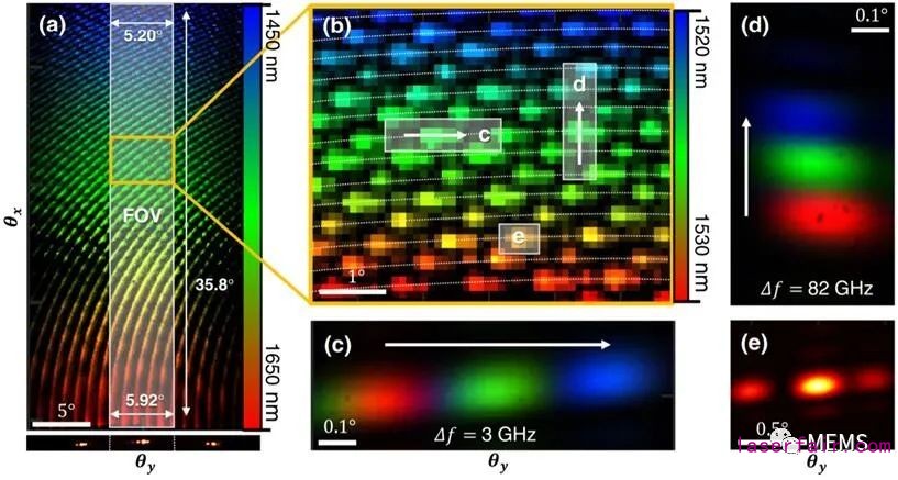 用單個(gè)SOPA瓦片演示2D波長操縱效果。(a)200 nm掃描的遠(yuǎn)場拍攝圖像,從16500個(gè)樣本中只取樣到1500個(gè)點(diǎn)。光柵瓣極限視場角為35.8° x 5.5°。為獲得可見度,采用掃描欠采樣(取樣率約10%)和飽和過度曝光的后處理,導(dǎo)致對角線曲線非實(shí)際掃描軌跡,曲率由群速度色散導(dǎo)致。底部顯示了1550 nm處的光斑圖,以顯示光柵波瓣受限的視場。(b)A 5° × 5.5°全掃描的分段,只有70個(gè)樣本。真實(shí)的掃描軌跡用虛線表示以引導(dǎo)人眼觀察,對顏色進(jìn)行重新編碼以適應(yīng)較窄的帶寬。(c)快軸波長掃描,三個(gè)不相鄰的點(diǎn)間距為3 GHz。(d)慢軸波長掃描,三個(gè)不相鄰的點(diǎn)間距為82 GHz。(e)1550 nm處的單波長光斑。