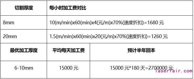 蔣總表示,在購買12kW設(shè)備前,他算了一筆賬:12kW目前可以切割6-30mm碳鋼,但是從效益考慮,空氣切割6-10mm對比千瓦級別的效率更高,氣體成本更低,平均下來每天可收入15000元加工費?,F(xiàn)在已經(jīng)經(jīng)過三四個月的穩(wěn)定使用,半年回本預(yù)期基本可實現(xiàn)。
