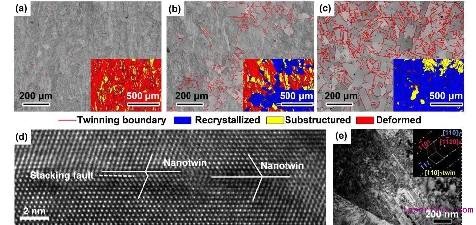 圖5 SLM打印FeCoCrNi高熵合金在(a) 1173K, (b) 1373K, and (c) 1573K下2h退火后的孿晶分布同圖,右上角圖像為再結(jié)晶分布圖;(d)SLM打印CoCrFeMnNi高熵合金的納米孿晶HRTEM圖;(e)SLM打印FeMnCoCrC0.5高熵合金在12%應(yīng)變下納米納米雙hcp片層復(fù)合結(jié)構(gòu).