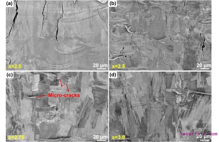 SLM打印HEA的結(jié)構(gòu)特點(diǎn)主要體現(xiàn)在兩方面:宏觀缺陷和微觀結(jié)構(gòu)??斩葱腿毕菔荢LM中最常見(jiàn)的缺陷,如未凝固的顆粒和孔洞。作為一種成分復(fù)雜的新型材料,HEAs易產(chǎn)生孔隙缺陷,且其是造成密度損失的主要原因。通過(guò)改變打印參數(shù)提高體積能量密度能夠有效的抑制孔洞的產(chǎn)生,如圖2所示。裂紋是另一種常發(fā)的缺陷,與合金成分有密切聯(lián)系,如增加AlCrCuFeNi中Ni元素的成分可以有效的抑制裂紋,如圖3所示。由于HEA元素種類(lèi)較多,調(diào)控元素成分控制裂紋的研究將會(huì)非常豐富。此外,元素偏析、夾渣等典型的增材制造缺陷也會(huì)出現(xiàn)在SLM打印的HEA中。