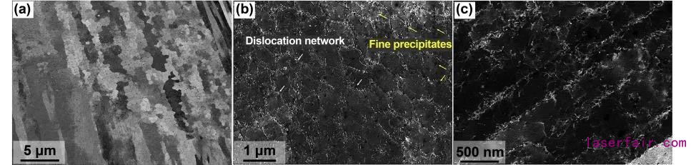 由于SLM工藝具有復(fù)雜的熱循環(huán)和極高的冷卻速率(106K/s),其制備的HEA晶粒的尺寸低至幾微米,且可以產(chǎn)生很高密度的位錯(cuò)、亞晶界、納米孿晶等,如圖4所示,這將極大提升HEA機(jī)械性能。另一個(gè)顯著特點(diǎn)是SLM打印的HEA更容易產(chǎn)生析出相。傳統(tǒng)工藝制造的HEA需要較長(zhǎng)時(shí)間的熱處理來(lái)產(chǎn)生析出相,而SLM打印HEA晶格的多界面或多缺陷特征為析出相提供了理想的生長(zhǎng)載體,只需較短時(shí)間的熱處理或不熱處理即可得到析出相。合金成分對(duì)于性能的影響至關(guān)重要。此外,對(duì)SLM打印的HEA進(jìn)行后續(xù)熱處理,還可以產(chǎn)生孿晶(如圖5所示)等微觀結(jié)構(gòu)。