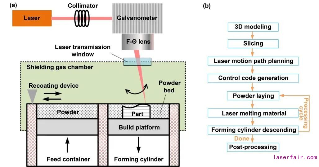 圖1(a)SLM工藝的原理圖解;(b)SLM的處理過(guò)程