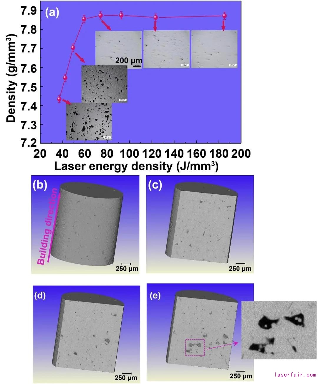 圖2(a)不同激光能量密度下的樣品密度;(b-e)123?J/mm3體積能量密度下的樣品中孔隙尺寸形態(tài)的XCT圖像