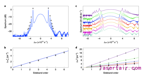 實(shí)驗(yàn)上將邊帶頻率的四次方和其階次對(duì)應(yīng),如圖3b所示,發(fā)現(xiàn)滿足線性關(guān)系,與理論符合。并且,改變四階色散的值,仍然滿足線性關(guān)系,如圖3d所示。