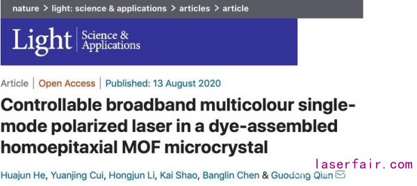 參考:Huajun He et al. Controllable broadband multicolour single-mode polarized laser in a dye-assembled homoepitaxial MOF microcrystal,Light: Science & Applications. DOI: 10.1038/s41377-020-00376-7