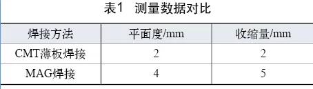 5)焊接變形較小。輕量化軌道交通車輛2mm外蒙皮,分別進(jìn)行CMT薄板焊接與MAG焊接的對(duì)接焊對(duì)比。一般薄板焊接后,會(huì)在焊縫長(zhǎng)度方向產(chǎn)生收縮變形,寬度方向產(chǎn)生角變形,通過測(cè)量外蒙皮試板的收縮量和變形量,判斷CMT薄板焊接的優(yōu)異性。在焊后通過對(duì)外蒙皮試件的收縮量和變形量進(jìn)行測(cè)量,得知CMT焊接產(chǎn)生的變形量和收縮量均小于MAG焊接,見表1。