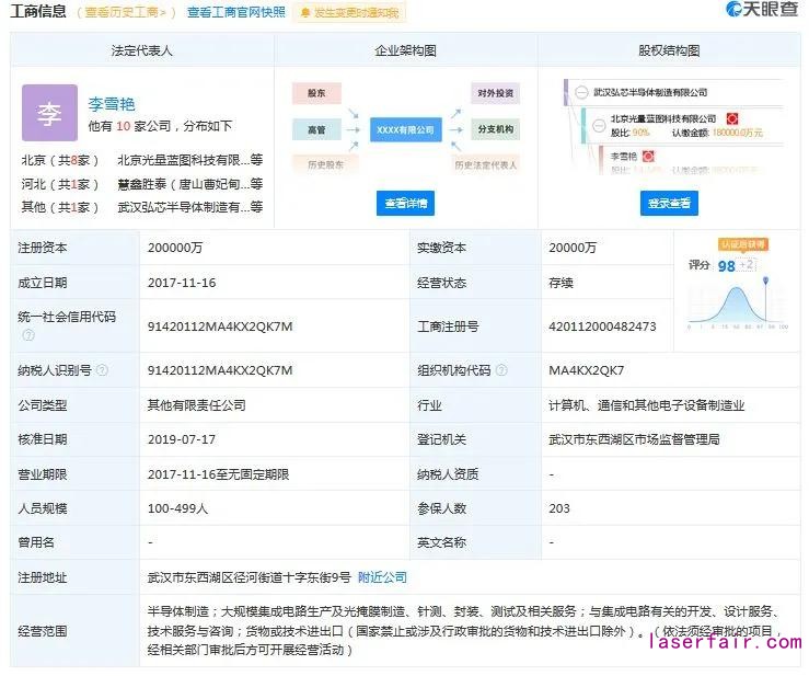 但弘芯已經(jīng)完成的153億元投資,沒有公開信息顯示包括了哪些內(nèi)容。注冊(cè)資金20億元中,目前僅有持股10%的武漢臨空港經(jīng)濟(jì)技術(shù)開發(fā)區(qū)工業(yè)發(fā)展投資集團(tuán)有限公司兌現(xiàn)了2億元的投資承諾,大股東北京光量藍(lán)圖科技有限公司實(shí)際繳納的資本掛零。而且公司章程規(guī)定,北京光量的發(fā)起人在2045年12月之前都不用出資。