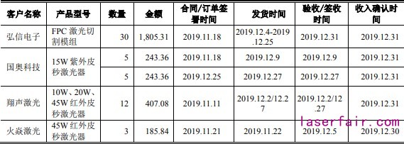 從上表中可以發(fā)現(xiàn),弘信電子、國(guó)奧科技、翔聲激光、火焱激光收入確認(rèn)時(shí)間集中在 2019 年 12 月末,而且國(guó)奧科技、翔聲激光激光器發(fā)貨時(shí)間與簽收時(shí)間同一天。