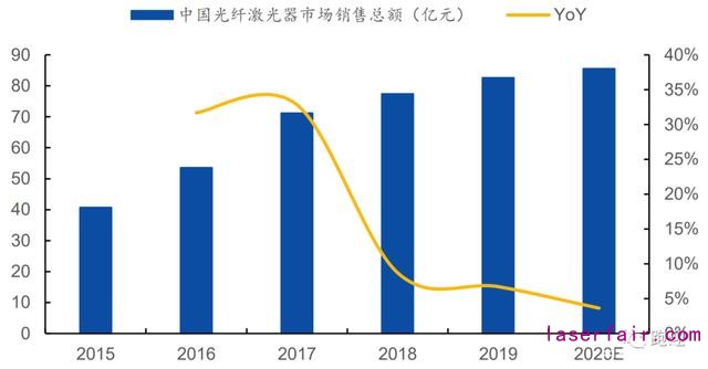 根據(jù)2020 中國(guó)激光產(chǎn)業(yè)發(fā)展報(bào)告,2019 年中國(guó)光纖激光器市場(chǎng)銷售總額 85.6 億元,同比增長(zhǎng) 6.72%,受全球經(jīng)濟(jì)不確定性影響預(yù)計(jì) 2020 年同比增長(zhǎng) 3.63%,短期增速有所放緩,伴隨中國(guó)制造業(yè)逐漸復(fù)蘇不改長(zhǎng)期增長(zhǎng)趨勢(shì)。