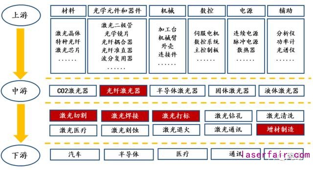 激光技術(shù)起源于20 世紀(jì)60 年代,與原子能、半導(dǎo)體、計(jì)算機(jī)并稱20 世紀(jì)新四大發(fā)明之一,被為“最快的刀”,“最準(zhǔn)的尺”,應(yīng)用廣泛。當(dāng)代激光技術(shù)已被應(yīng)用于材料加工、通信與光存儲(chǔ)、醫(yī)療與美容、研發(fā)與軍事、儀器與傳感器、娛樂顯示、增材制造等重要領(lǐng)域,其中又以材料加工和通信領(lǐng)域應(yīng)用最為廣泛。隨著激光器制造工藝的發(fā)展與升級(jí),激光技術(shù)已用于金屬與非金屬的打標(biāo)、切割、焊接、微加工、劃片、刻蝕、光刻等工藝,其效率高、速度快、強(qiáng)度大、精度準(zhǔn)的優(yōu)勢(shì)逐步使其取代部分傳統(tǒng)加工工藝。此外,激光技術(shù)在3D 打印、3D 影像、LED、OLED、光學(xué)測(cè)量、數(shù)據(jù)監(jiān)測(cè)、臨床醫(yī)學(xué)、美容整形、激光雷達(dá)等新興領(lǐng)域中也發(fā)揮著不可替代的作用。