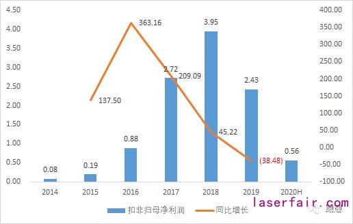 2014-2019年,營(yíng)業(yè)收入由2.32億元增長(zhǎng)至20.10億元,復(fù)合增長(zhǎng)率54.01%,19年同比增長(zhǎng)37.49%,2020H1實(shí)現(xiàn)營(yíng)收同比下降29.91%至7.09億元;歸母凈利潤(rùn)由0.13億元增長(zhǎng)至3.25億元,復(fù)合增長(zhǎng)率90.37%,19年同比下降24.81%,主要受 2019 年價(jià)格戰(zhàn)加劇影響,2020H1實(shí)現(xiàn)歸母凈利潤(rùn)同比下降69.33%至0.67億元;扣非歸母凈利潤(rùn)由0.08億元增長(zhǎng)至2.43億元,復(fù)合增長(zhǎng)率97.93%,19年同比下降38.49%,2020H1實(shí)現(xiàn)扣非歸母凈利潤(rùn)同比下降67.77%至0.56億元;經(jīng)營(yíng)活動(dòng)現(xiàn)金流分別為0.04億元、-0.04億元、1.23億元、2.04億元、2.62億元、-0.58 億元,2020H1實(shí)現(xiàn)經(jīng)營(yíng)活動(dòng)現(xiàn)金流同比下降1497.46%至-2.64億元。
