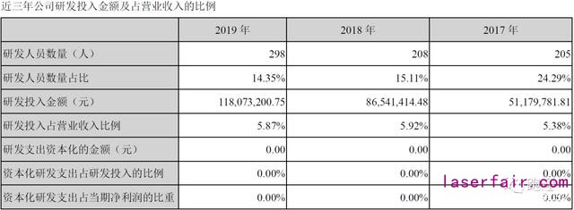 根據(jù)公司的總體發(fā)展戰(zhàn)略,公司的研發(fā)主要圍繞高功率光纖激光器及其關(guān)鍵器件等項(xiàng)目進(jìn)行。公司持續(xù)加大研發(fā)投入,為公司的持續(xù)發(fā)展提供強(qiáng)有力的技術(shù)支撐和產(chǎn)品支撐,并為公司未來的發(fā)展培育新的增長(zhǎng)點(diǎn)。2019年度,公司研發(fā)費(fèi)用總額11,807.32萬元,占公司營(yíng)業(yè)收入的比例為5.87%,占公司歸屬于上市公司所有者權(quán)益的比例為5.15%。