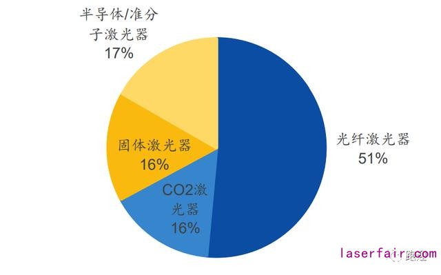 光纖激光器市場(chǎng)份額占比從 2013年的33.8%提升至 2018年的 51.5%,成為市場(chǎng)最大激光器品種。根據(jù) Strategies Unlimited 公告的數(shù)據(jù),2010-2018 年光纖激光器市場(chǎng)銷售規(guī)模從3.3 億美元上升至 26.0 億美元,年復(fù)合增長(zhǎng)率 26.0%。2019 年預(yù)計(jì)光纖激光器銷售收入可達(dá) 27.46 億美元,有望步入穩(wěn)中有進(jìn)階段,未來市場(chǎng)空間廣闊。固體激光器、氣體激光器和半導(dǎo)體激光器的市場(chǎng)份額逐年下降,2018 年份額分別為 15.7%、16.2%和 16.7%。