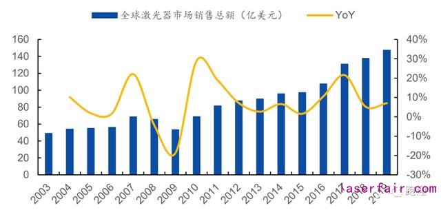 據(jù)中國(guó)科學(xué)院武漢文獻(xiàn)情報(bào)中心、中國(guó)激光雜志社、中國(guó)光學(xué)學(xué)會(huì)統(tǒng)計(jì),2019 年全球激光器銷售額 147.3 億美元,同比增長(zhǎng) 7.1%,自 2018 年中美貿(mào)易戰(zhàn)開始,激光產(chǎn)品進(jìn)出口受到一定沖擊,2018 年激光產(chǎn)業(yè)規(guī)模增速大跌至 5.27%,伴隨貿(mào)易戰(zhàn)緩解,產(chǎn)業(yè)規(guī)模增速呈回升趨勢(shì),2019 年增速同比提升 2.88 個(gè)百分點(diǎn)。2020 年受全球經(jīng)濟(jì)增速放緩及新冠疫情影響,預(yù)計(jì) 2020 年全球激光器產(chǎn)業(yè)規(guī)模將有所收縮。