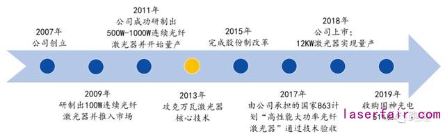 銳科激光成立于2007年;2009年研制出100W連續(xù)光纖激光器并推入市場(chǎng);2011年公司成功研制出500W-1000W連續(xù)光纖激光器并開始量產(chǎn);2013年攻克萬瓦激光器核心技術(shù);2015年完成股份制改制;2018年上市,12KW激光器實(shí)現(xiàn)量產(chǎn);2019年收購(gòu)國(guó)神光電51%股權(quán),正式步入超快激光器領(lǐng)域。