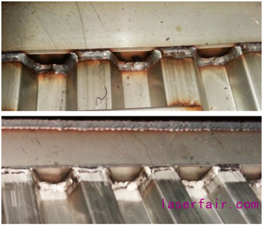 以激光清洗在不銹鋼列車制造環(huán)節(jié)中的應(yīng)用為例,可有效去除不銹鋼表面油污、拉絲墻板點焊焊痕、不銹鋼電弧焊后氧化、拉絲墻板激光焊殘膠等,效果優(yōu)秀。