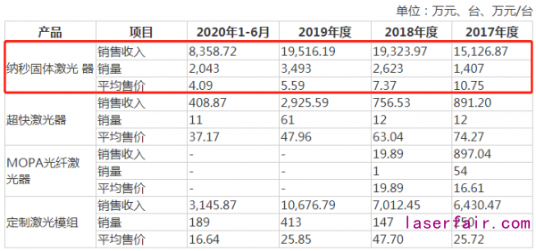 招股書顯示,英諾激光的激光器業(yè)務(wù)以銷售納秒固體激光器和超快激光器為主,2017-2020年上半年,上述兩類激光器的銷售收入占該公司激光器銷售收入的比例分別為94.7%、99.9%、100%和100%。其中納秒固體激光器銷售金額分別為1.51億元、1.93億元、1.95億元和0.84億元,占激光器銷售總收入的比例分別為89.43%、96.14%、86.96%和95.34%,是英諾激光的核心主導(dǎo)產(chǎn)品。