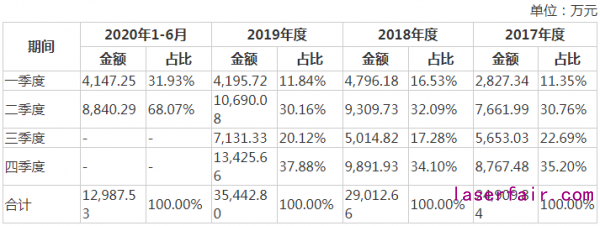 招股書顯示,英諾激光的營業(yè)收入易受季節(jié)波動影響,具體而言,其第二、四季度主營業(yè)務(wù)收入占比高于第一、三季度。