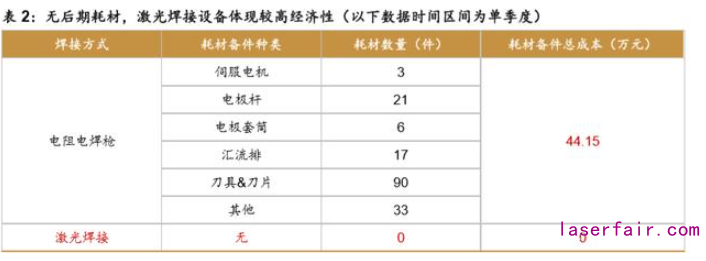 激光焊接經(jīng)濟(jì)性已經(jīng)凸顯。根據(jù)文獻(xiàn)《激光焊接在白車身上的應(yīng)用現(xiàn)狀》(2016 年), 北京奔馳白車身生產(chǎn)線中,傳統(tǒng)電阻電焊槍焊接方式設(shè)備初期采購成本較低,一條產(chǎn)線以 205 臺電焊槍計,每臺成本我們假設(shè)為 2000 元,則一次采購成本約 41 萬元。但傳統(tǒng)電阻焊耗材 金額較高,包括伺服電機(jī)、電極桿、電極套筒在內(nèi)的配套備件每季度消耗金額約 44 萬元(文 獻(xiàn)數(shù)據(jù));而激光焊接設(shè)備雖然一次采購成本較高,但后期幾乎無耗材支出。我們假設(shè)如今 一臺激光焊接設(shè)備均價為 100 萬元,每條產(chǎn)線配備 2 臺激光焊接設(shè)備,則一次采購成本為 200 萬元,相比傳統(tǒng)電阻焊高出 159 萬元。但因耗材成本的節(jié)約,激光焊接設(shè)備在 4 個季度 內(nèi)即可抹去一次采購成本差(159<44×4)。