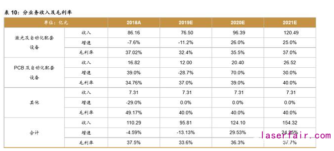 假設(shè) 1:激光設(shè)備板塊,2019 年受下游需求趨穩(wěn)影響短暫回調(diào);展望 2020 年,小功率 板塊有望受益下游客戶創(chuàng)新力度提升再獲高增長;大功率板塊有望受益核心激光器光源自產(chǎn) 提升盈利能力,此外下游焊接市場在激光設(shè)備經(jīng)濟(jì)性持續(xù)顯現(xiàn)及制造業(yè)升級背景下有望開啟 高速增長期。我們假設(shè)公司2019/2020/2021板塊營收同比增速分別為-11.2%/26.0%/25.0%; 毛利率方面,受益產(chǎn)品結(jié)構(gòu)改善疊加激光器光源持續(xù)推進(jìn)自產(chǎn),假設(shè)公司 2019/2020/2021 板塊毛利率分別為 32.4%/35.5%/37.0%。