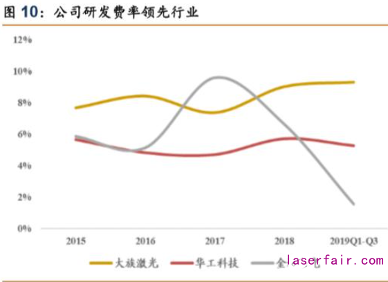 研發(fā)投入持續(xù)高位,領(lǐng)先國內(nèi)同行業(yè)企業(yè)。根據(jù)公司 2019 年三季報,公司 2019 前三 季度研發(fā)費(fèi)率為 9.3%,同比+2.0pp,研發(fā)投入持續(xù)增長;橫向?qū)Ρ葋砜?,國?nèi)激光設(shè)備行 業(yè)的華工科技同期研發(fā)費(fèi)率為 5.3%、金運(yùn)激光為 1.6%。