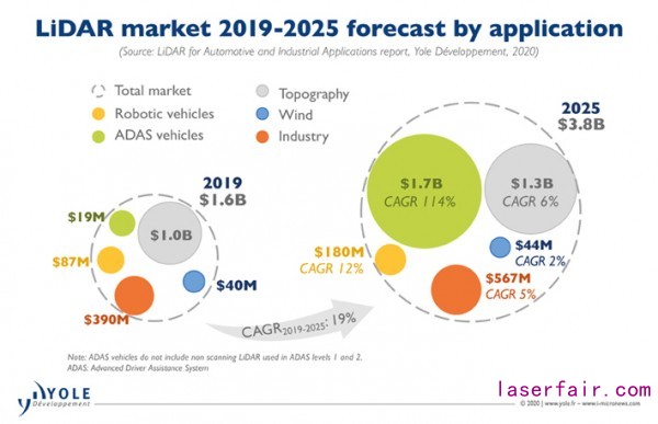 Yole技術(shù)和市場分析師Alexis Debray表示:“高級駕駛輔助系統(tǒng)(ADAS) 的LiDAR市場將實(shí)現(xiàn)114%的年增長率,從2019年的1900萬美元增長到2025年的17億美元。”(如圖1) 期望如此之高,但激光雷達(dá)市場面臨阻礙,急需大膽創(chuàng)新。