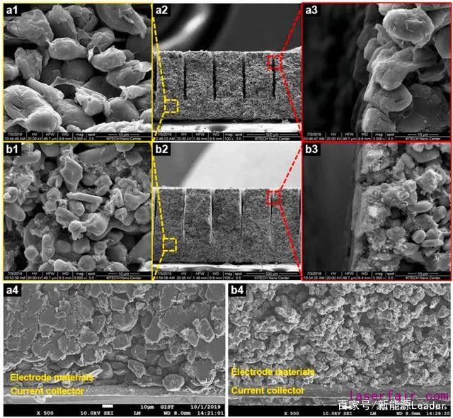 圖1.(a)石墨負(fù)極和(b)LCO正極的SEM;(a1)、(b1)和(a3)、(b3)是未成型和激光成型區(qū)域的放大圖。(a2)、(b2)是截面圖。(a4)、(b4)是電極集流體附近的圖像。