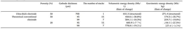 表1. 基于厚度和孔隙率,比較激光成型電極與傳統(tǒng)電極的體積和重量能量密度。