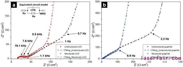 在XPS數(shù)據(jù)中,C-C峰強(qiáng)增加,在激光成型區(qū)域的局部碳化導(dǎo)致顆粒與顆粒接觸改善,以至于降低了LCO整體電子電阻。石墨電極的EIS數(shù)據(jù)中沒有電子阻抗一項。作者認(rèn)為石墨顆粒之間的電子導(dǎo)電性以及石墨電極和銅集流體之間的接觸電導(dǎo)性很好。在低頻區(qū)域,經(jīng)過激光成型,LCO和石墨的離子阻抗均降低。這是因為激光成型縮短和放大了了離子擴(kuò)散的路徑。特別是,擴(kuò)散面積增大(大約440%),激光成型區(qū)域和電解質(zhì)的界面增大。
