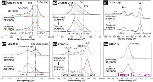 未成型和激光成型的石墨和LCO電極顯示類似的XPS光譜。對于石墨電池,C1s(石墨在284.5eV左右,CMC在288.8eV左右,見圖2(a1))降低歸因于激光燒蝕導(dǎo)致的部分粘結(jié)劑和活性材料去除。O 1s光譜也發(fā)生輕微變化,歸因于激光成型過程中電極表面發(fā)生氧化。盡管由于激光燒蝕導(dǎo)致C 1s和O 1s的原子百分比發(fā)生輕微變化,但是并沒有因為激光成型導(dǎo)致新峰出現(xiàn)。對于LCO電極,未成型和激光成型樣品的Co 2p光譜(在大約780eV的Co 2p3/2峰以及接近+10eV的衛(wèi)星峰)沒有區(qū)別。