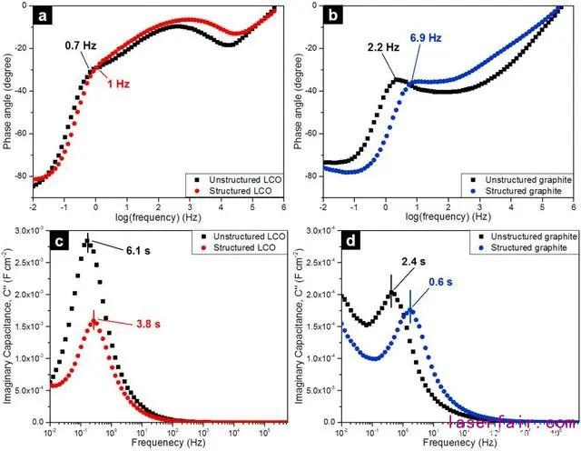 采用非插入鋰鹽,測試了對稱電池的EIS,結(jié)果顯示在最低頻范圍具有傳質(zhì)特性和電容特性。當(dāng)電極上發(fā)生非法拉第反應(yīng),在Nyquist圖上出現(xiàn)垂直于x軸的直線,對應(yīng)-90°的Bode相位角。在圖5a和b的Bode曲線中,最低bode相位角表明具有電容性質(zhì),分別對應(yīng)未成型和激光成型LCO正極的頻率為0.7Hz和1.0Hz。類似,未成型和激光成型石墨負(fù)極的最低相位角對應(yīng)的頻率分別為2.2Hz和6.9Hz??紤]電容性質(zhì)的出現(xiàn)意味著在導(dǎo)電固相表面形成了雙電層,因此激光成型LCO和石墨電極在相對高頻區(qū)的傳質(zhì)速率快于未成型電極。
