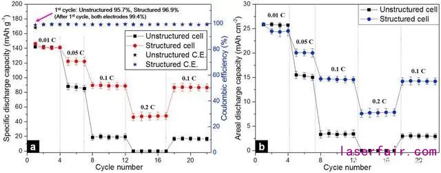 從未成型和激光成型的全電池的倍率性能和面容量可知,在低倍率(0.01C)下,放電容量幾乎與理論容量一樣(140mAh/g)。兩種電極顯示高而且?guī)缀跸嗤膸靷愋省T诒堵试黾訒r,仍然保持高庫倫效率。因此作者認(rèn)為,未成型和激光成型電池能正常使用,不存在因厚電極制備過程造成的如內(nèi)部裂縫、集流體剝離或電解液浸潤差的缺陷。當(dāng)增加電流倍率時(從0.05C增加到0.2C),未成型電池的放電容量急劇降低。此外,未成型電池在0.2C的容量完全不可用。相反,激光成型電池在0.05C的放電容量比未成型電池高50%。當(dāng)倍率增大時,兩者的差異進(jìn)一步放大。激光成型電池的可用容量比未成型電池低約5%;這與質(zhì)量損失吻合,其與激光燒蝕造成的容量損失直接正相關(guān)。在低倍率(0.05C)下,激光成型電池的可用容量比未成型電池高35%。在相對高倍率下(0.1C),激光成型電池的可用容量是未成型電池的5倍之多。