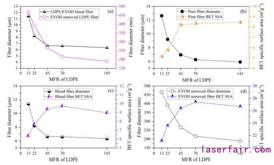 隨著MFR的增加,觀察到純LDPE和去除EVOH的LDPE纖維直徑呈線性減小。但是,由于組分的熔體粘度提高,較高MFR下的LDPE/EVOH共混纖維的直徑略有增加。從共混纖維中去除EVOH后,纖維直徑大幅度減小,從而使超細纖維恢復(fù)到穩(wěn)定的納米尺寸。