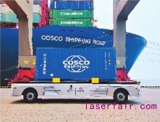 中遠(yuǎn)海運(yùn)港口廈門遠(yuǎn)海碼頭,東風(fēng)商用車無(wú)人駕駛集裝箱卡車進(jìn)行作業(yè)。